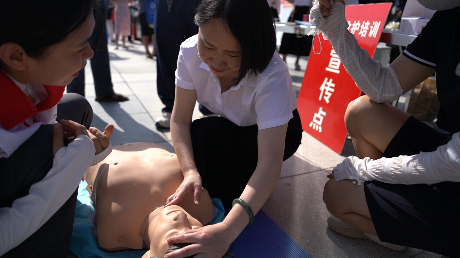 在应急救护体验区,专业人员现场演示心肺复苏、AED使用等急救技能,并邀请群众亲自上手操作。群众热情高涨,纷纷踊跃参与,在专业指导下,认真学习每一个动作要领,切实掌握应急救护的基本技能。