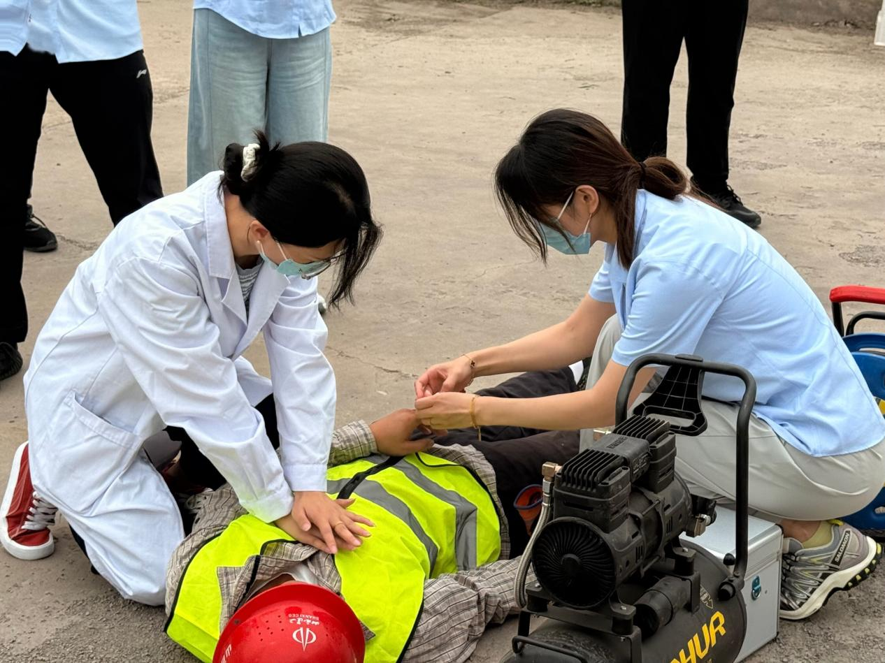 本次演练场景为公司仓库一维保作业人员在使用电动工具时发生触电事故,立即上报公司应急指挥部并启动公司应急预案。各应急小组迅速响应、紧密配合,有序完成了救援并对伤员实施心肺复苏,联络120待命,及时送往就近医疗救护点,顺利完成了对伤者的紧急救治。