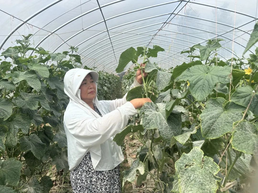 “夫妻档”变身“领头雁”经过多年发展,“红成家庭农场”已形成集种苗繁育、大棚种植、产销对接于一体的完整产业链,年纯收入达二十万元。但夫妻俩始终记得“先富带后富”的初心。 “我以前没啥手艺,只能到处打零工,一个月挣一千多块钱,家里日子过得紧巴巴的。”58岁的李桂兰蹲在自家菜地里,一边给番茄苗绑蔓一边说,“看见老刘家的农场效益好,我心里也跃跃欲试想种菜,他们两口子非常热心,手把手教我技术,现在我种了7亩果蔬,年收入超过十万元,生活比以前好多了。”绿油油的水果黄瓜很受市场欢迎。朱媛媛摄李桂兰的故事不是个例。在刘红翠夫妇的带动下,全村共有20余户村民发展起果蔬产业,农户们的货车排成队往城里送菜,车斗里的黄瓜、番茄,在阳光下闪着共同富裕的光。