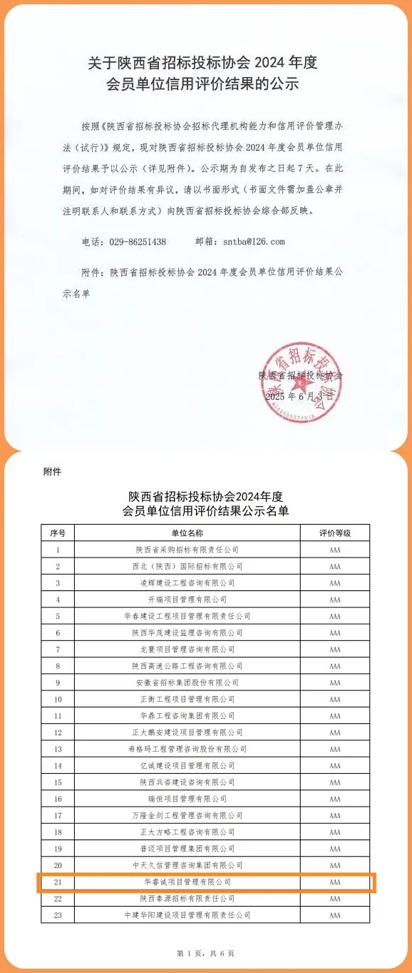 陕西省招标投标协会于6月3日发布《关于陕西省招标投标协会2024年度会员单位信用评价结果的公示》,华睿诚项目管理有限公司凭借在招标投标领域的专业实践与信用体系建设成果,经严格评审后,获评为 “2024年度会员单位信用评价AAA等级”。