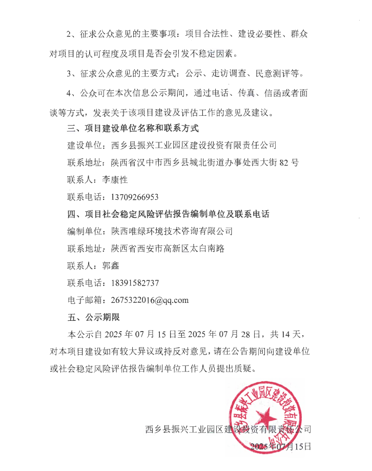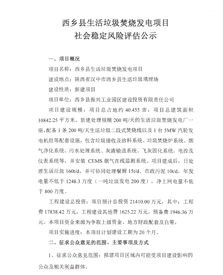 西乡县生活垃圾焚烧发电项目社会稳定风险评估公示