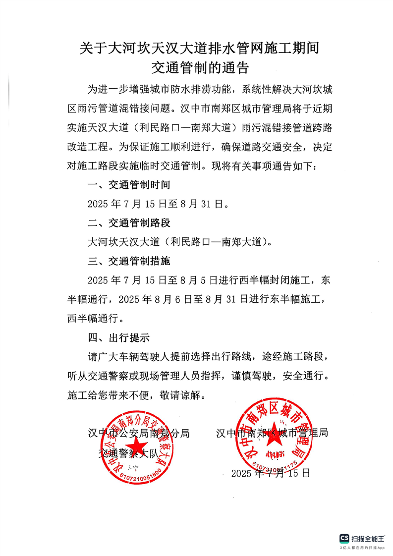 关于大河坎天汉大道排水管网施工期间交通管制的通告
