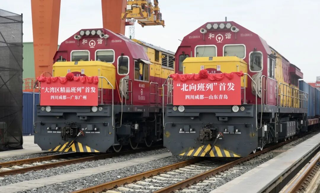 7月22日,两列满载元明粉、钛精矿的“北向班列”分别从成都、攀枝花鸣笛启程,驶向青岛、淄博;与此同时,首列满载电子设备、汽车零配件等货物的“北向班列”回程班列从青岛驶向成都。当天,两列“大湾区精品班列”也从成都和广州实现双向首发。同一时间实现两个班列、四地五列齐发。