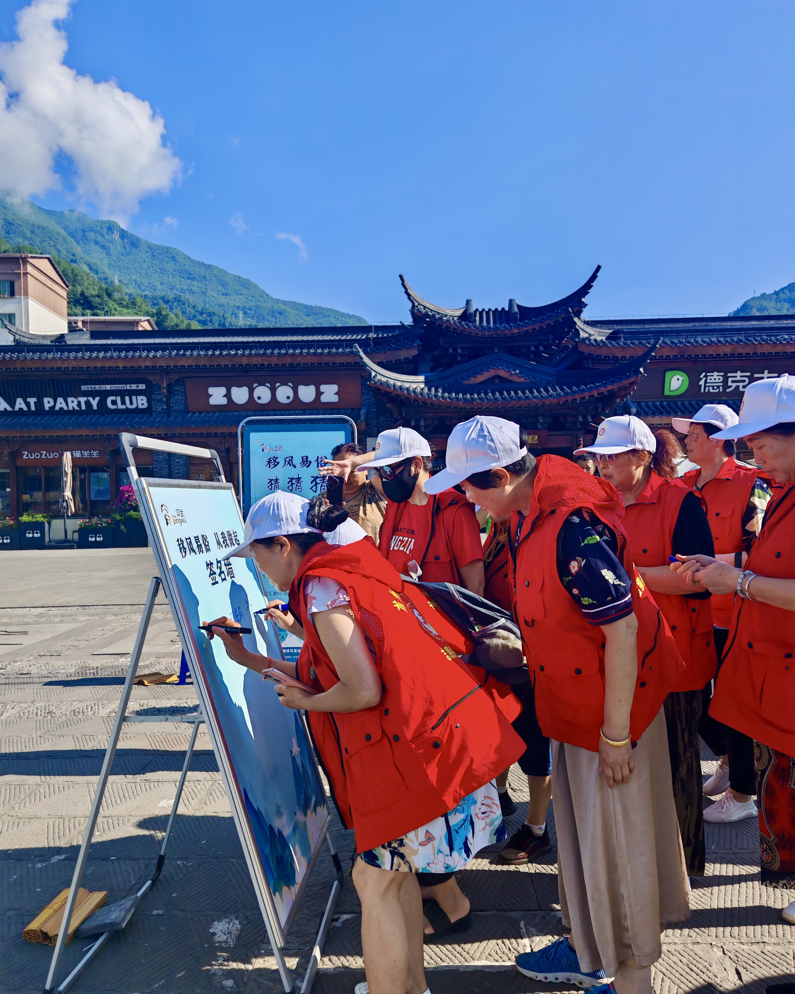 活动现场,“移风易俗 从我做起”签名墙前十分热闹。县委社工部志愿者和文明实践志愿者引导居民有序签名,并讲解签名承诺的意义,通过移风易俗宣传单,让文明理念在互动中传递。
