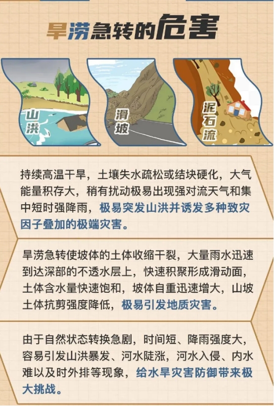 连日来,绵阳市正持续遭遇高温“烤”验。“久旱必涝”的俗语警示我们,高温干旱之后,极易发生“旱涝急转”!这种天气突变引发的洪水往往来得更快、势头更猛、破坏力更强,极易诱发山洪、泥石流、滑坡等自然灾害,对交通运输行业安全生产构成严重威胁,使公路边坡、桥梁隧道、在建工地等交通基础设施及运输环节风险增加。