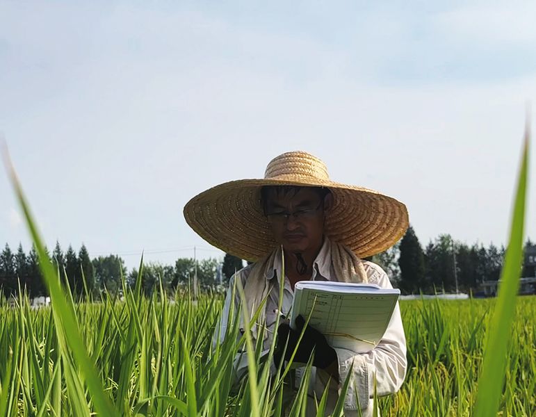 在绿油油的稻田里,李小刚头戴草帽,正专注查看手中记录册,认真开展田间数据观测与记录,为水稻种植管理提供科学依据。 记者 高思懿摄