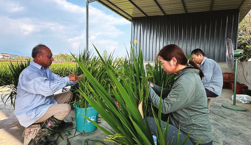 年轻科研人员王永琴的工装后背已结出盐霜,她正在给水稻去雄,指尖在米粒大小的颖花间灵活操作。“去雄就像做眼科手术,稍有不慎就会伤到柱头,导致前功尽弃。”她边说边用袖子擦去流进眼睛的汗水。