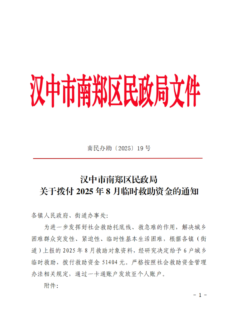 汉中市南郑区民政局关于拨付2025年8月临时救助资金的通知