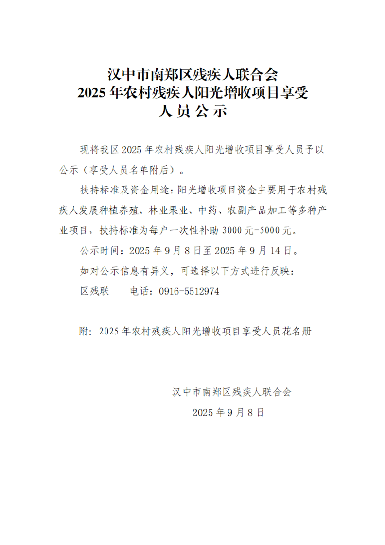 汉中市南郑区残疾人联合会2025年农村残疾人阳光增收项目享受人员公示