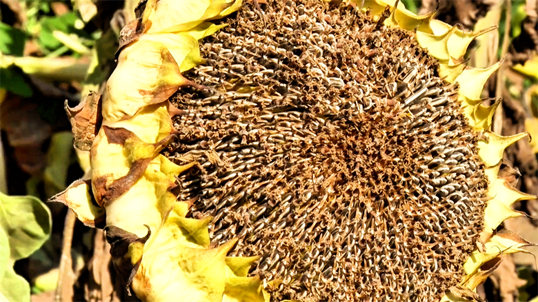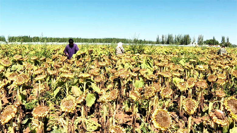 骆驼城镇碱泉子村的制种葵花基地里,又是另一番丰收景象。伴随着机器的轰鸣声,农户们将晾晒干的葵花盘逐一投入脱粒机,饱满的葵花籽源源不断地被分离出来。据介绍,向日葵不仅生长周期短、适应性强,还具备耐旱、耐盐碱的特性。种植户闫兴宁今年在该村流转土地640亩,种植制种葵花,他说,今年产出的葵花籽颗粒饱满、品质上乘,预计能有不错的收成。“从测盘到收有10天能收完,是订单,每公斤33元,目前看产量也还可以。”种植户闫兴宁说道。