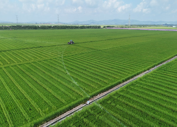阳光下,农场技术人员俯身细察初绽的稻花,育种田里一排排拖拉机随对讲机中的指令响起,同时展开机械赶粉作业。技术人员通过错期播种,调整“父本”和“母本”花期相遇,由拖拉机拖曳缆绳,在外力作用下,促使花粉上扬,提高授粉率,达到“异交结实”的目的。