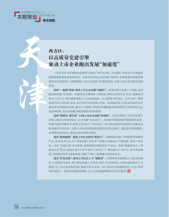 近日,《非公有制企业党建》刊发文章:《西青区:以高质量党建引擎 驱动上市企业跑出发展“加速度”》。