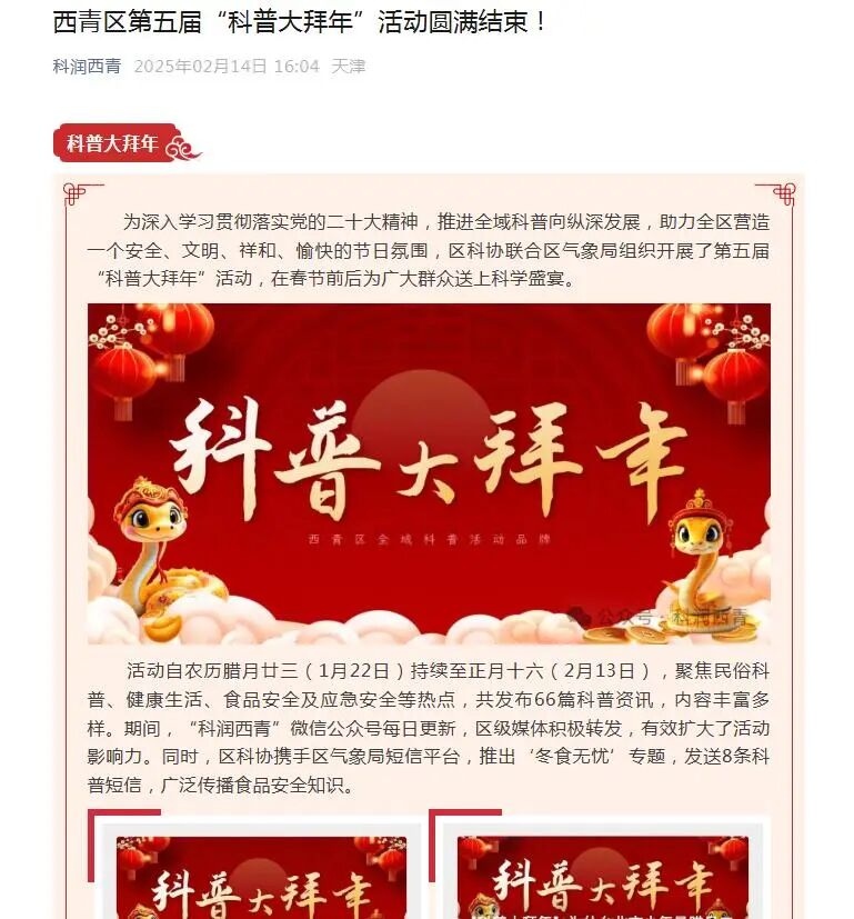 持续提升全媒体传播能力,发挥区级“两微一端”“两台一报”、各部门和街镇微信公众号及村(社区)宣传栏等平台作用,搭建多层次、广覆盖、全媒体的科普传播体系。已连续5年开展“科普大拜年”活动,组织了四届“科普四季惠民生”活动,在西青融媒网络平台开辟“全域科普五分钟”视频栏目。“科润西青”“科普大拜年”先后入选天津市全域科普品牌。科技周、科普日主场活动及西翼论坛等重点活动被学习强国、中宏网、津云、北方网、天津科协、天津西青、西青电视台、西青融媒等多家平台报道。全区科普中国信息员达17000余人,转发科普信息919余万次。