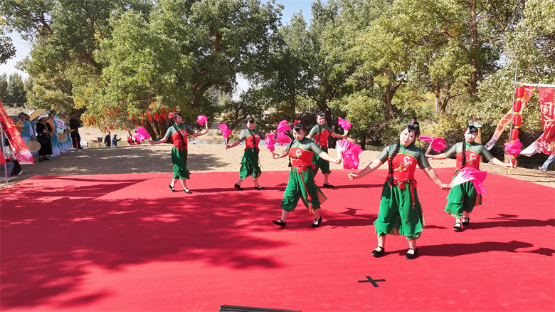 活动在热情洋溢的舞蹈《花千树》中拉开序幕,随后《九头胡杨的梦》《千年守望·胡杨》两篇配乐诗朗诵,用深情文字讲述胡杨“三千年”的生命传奇。女声独唱《梦中的胡杨》、男声独唱《大漠长歌》,以歌声传递对胡杨的眷恋与对故土的热爱。舞蹈《胡杨下的赛乃姆》融合民族风情,《跃动红歌》《万泉河水》《火火的中国》展现红色基因与时代激情,拉丁舞《绽放》迸发青春活力,民歌对唱《小放牛》则带来质朴乡韵。整场演出在多样艺术形式中,让胡杨精神与文化魅力深入人心。一曲曲旋律、一幕幕舞姿,将胡杨风骨与时代活力交织成动人画卷。“为了贴合胡杨节主题,团队修改了舞蹈动作,特意在舞蹈里加了胡杨‘不屈’的动作,希望用舞蹈传递胡杨精神,也展现多民族文化的交融之美。”演员李文秀说。