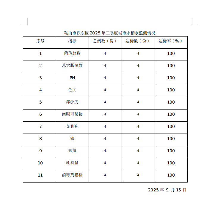 鞍山市铁东区2025年三季度城市末梢水监测情况