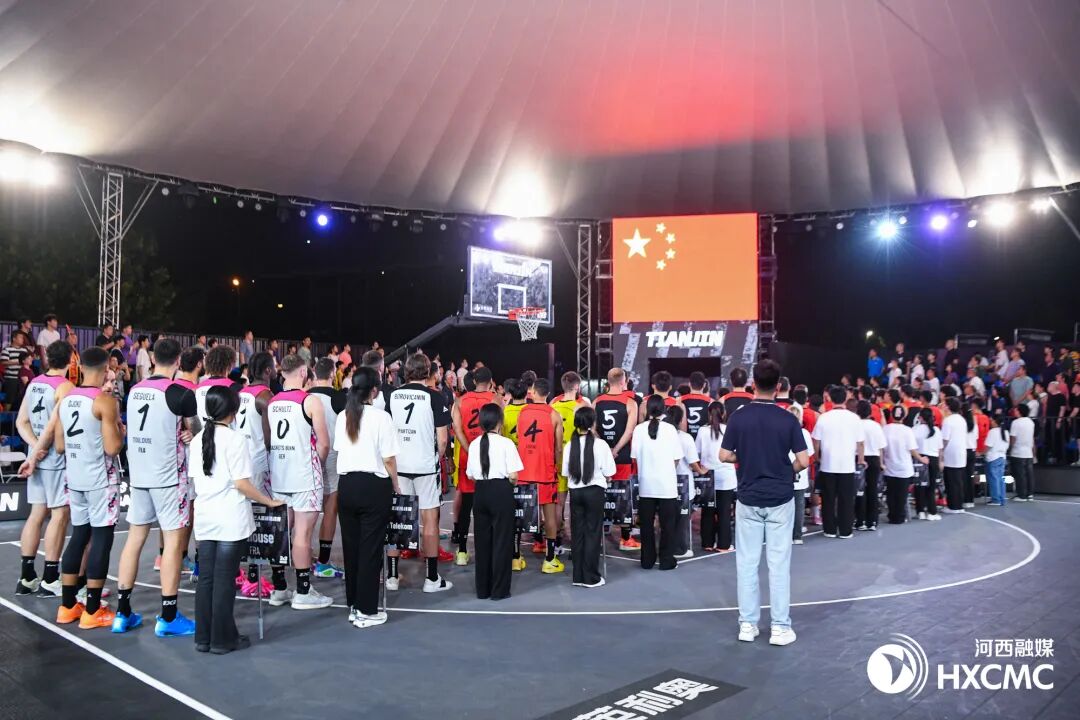 在奏唱中华人民共和国国歌后,出席活动的领导和嘉宾共同启动了本次赛事,正式揭开了2025国际篮联三人篮球挑战赛(天津站)的序幕。