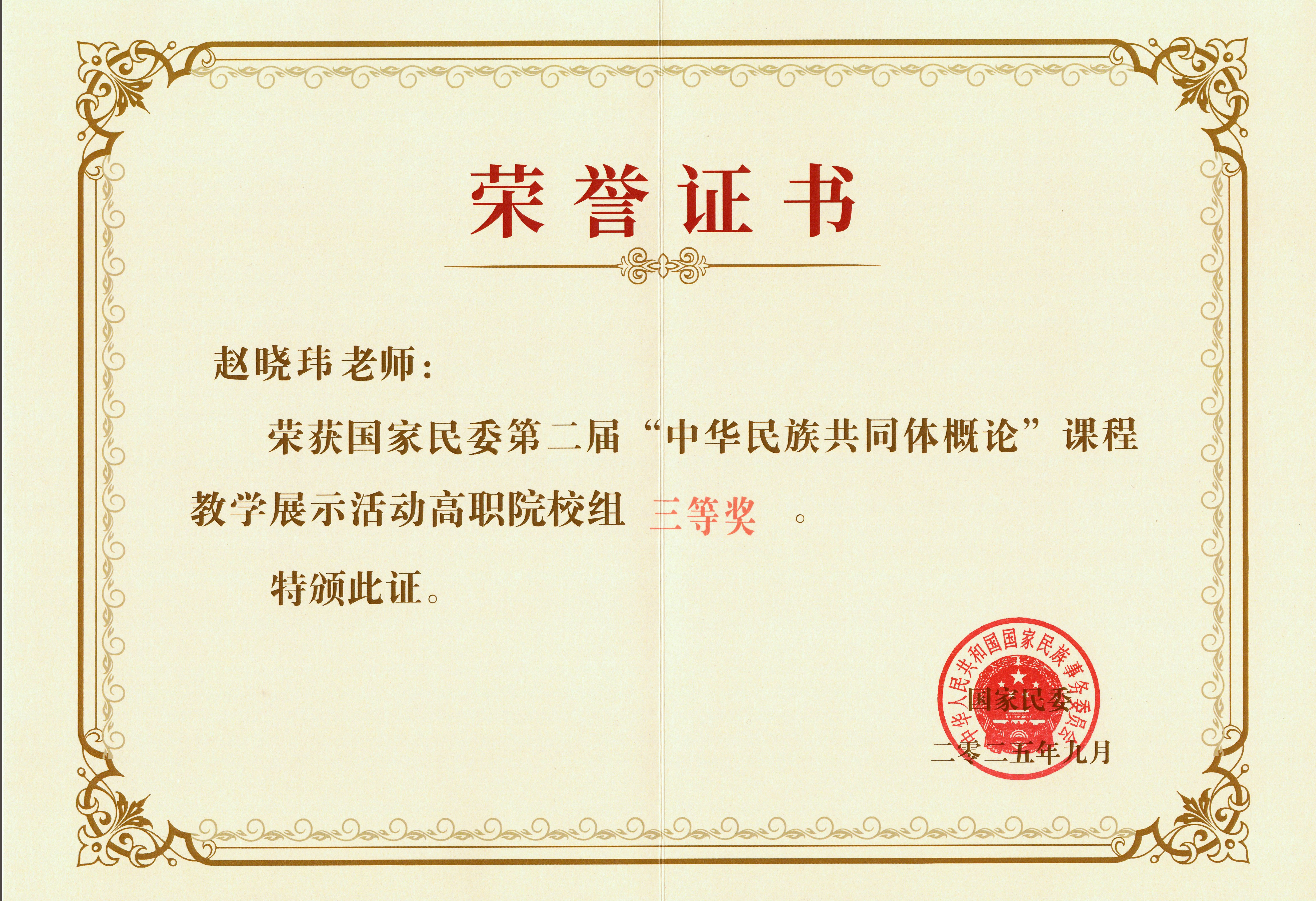 9月17日至19日,由国家民委主办、教育部协办、中南民族大学与高等教育出版社共同承办的第二届《中华民族共同体概论》课程教学展示活动在湖北武汉成功举办。我校马克思主义学院教师赵晓玮在本次展示活动中荣获高职组三等奖。