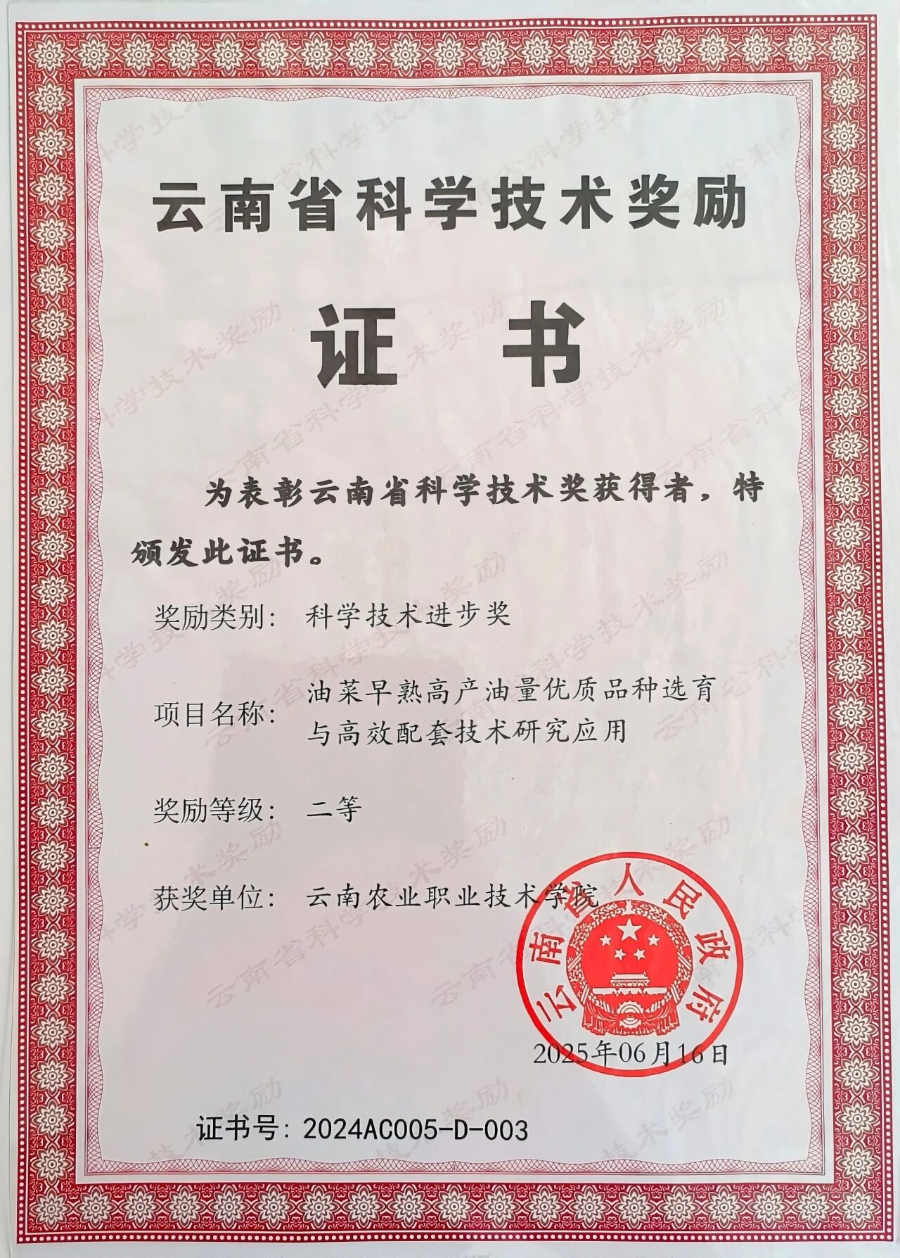 我校与云南省农业科学院经济作物研究所等科研团队共同完成的《油菜早熟高产量优质品种选育与高校配套技术研究应用》项目,凭借突出的创新性和较大的应用价值,荣获云南省科学技术进步奖二等奖,这是我校在油菜育种工作中取得的又一重要成果。
