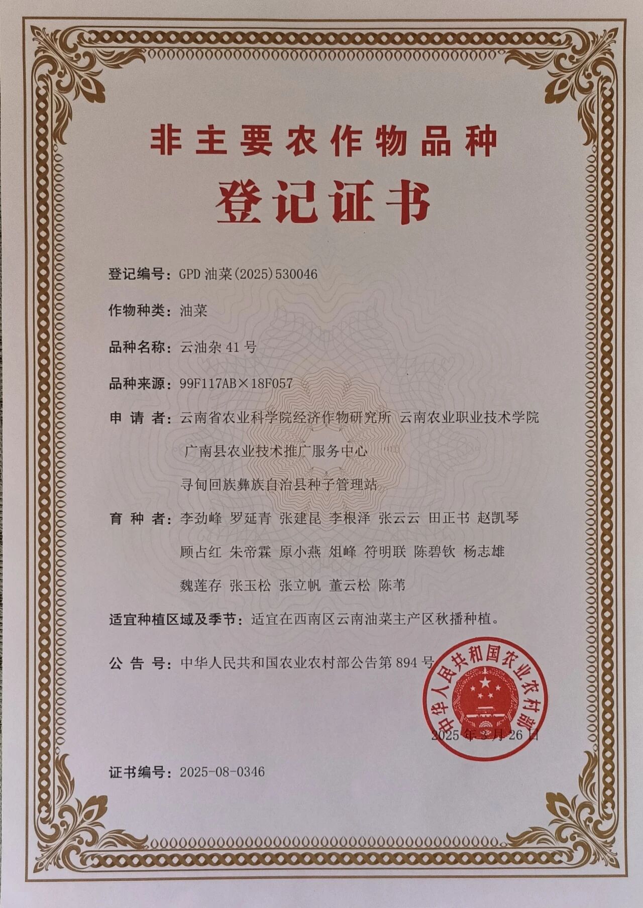 近日,由我校小哨校区云南省油菜育种联合基地与云南省农业科学院经济作物研究所联合选育的油菜新品种“云油杂41号”获准《中华人民共和国农业农村部公告第894号》认定登记,标志着我校在油菜育种领域的科研实力再获认可。