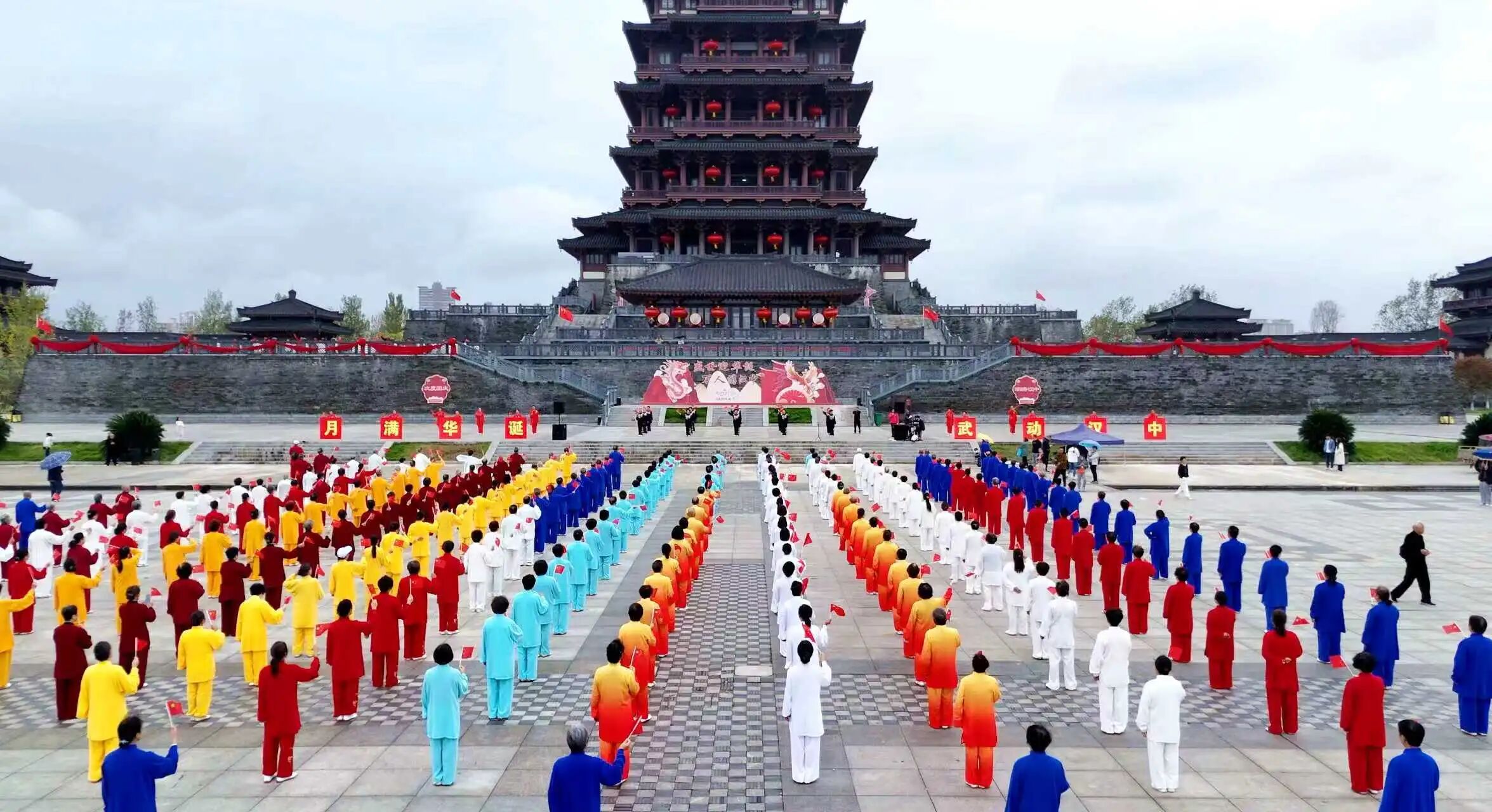 在天汉楼广场,太极爱好者身着统一服装整齐列队,成为广场上一道亮眼的风景线。随着悠扬婉转的音乐缓缓流淌,爱好者们抬手、转身、屈膝,动作行云流水。