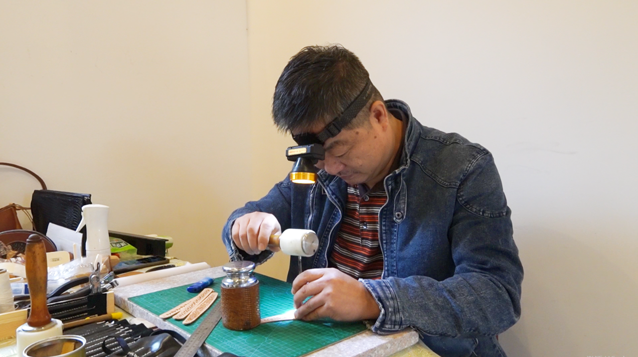 西郊记忆特色街区里,非遗手工艺人专注演示皮雕技艺。左手按牛皮,右手握錾刀,小锤 “笃笃” 敲击,缠枝莲纹渐显。展台上,带着精致纹样的手环、背包、钥匙扣,每一件都透着匠心。
