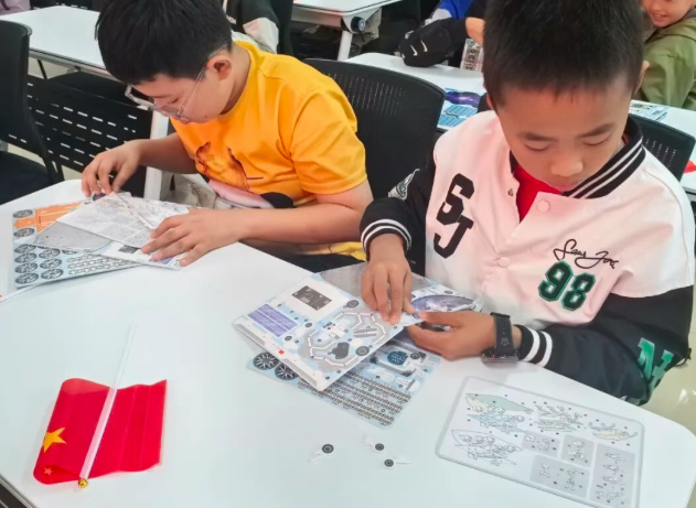 航空主题手工拼搭环节成为点燃梦想的舞台。孩子们拿到长征火箭模型材料后,立刻化身“小小工程师”,有的对照图纸拼接箭体结构,有的用彩笔在整流罩上绘制五星红旗,还有的别出心裁地用橡皮泥制作“宇航员”端坐舱内。“我拼的火箭未来要送航天员去火星!”少年的童言童语中,涌动着对国家航天事业的无限憧憬,也让民族自豪感在指尖的创造中悄然升华。