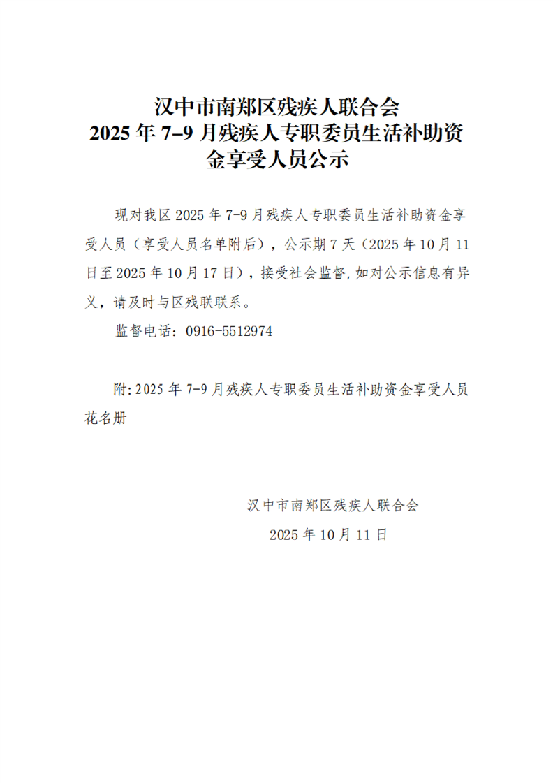汉中市南郑区残疾人联合会2025年7-9月残疾人专职委员生活补助资金享受人员公示