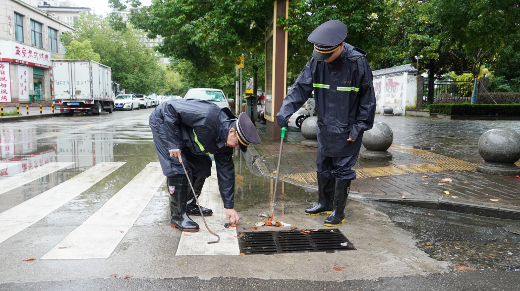 “这里地势低,树叶杂物一多就容易堵,必须及时疏通。”杨磊俯下身,徒手将堵塞在雨水井盖缝隙中的树枝、淤泥一把把掏出,积水随之加速下降。他们的动作迅速而熟练,尽管浑身湿透,泥浆沾满裤腿,但没有人退缩。除了重点路口,执法队员们还加强了对辖区易涝点、施工工地周边的巡查,及时排查隐患,确保排水设施畅通,最大限度减少积水对交通和市民生活的影响。