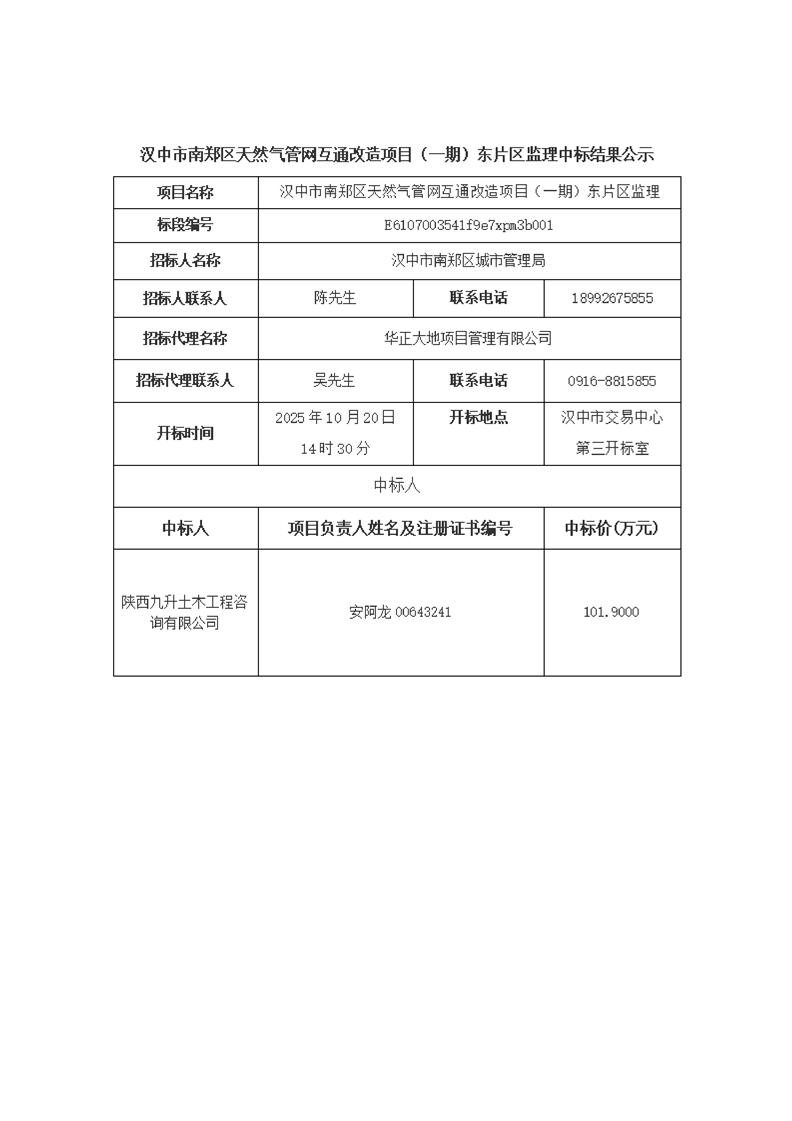 汉中市南郑区天然气管网互通改造项目(一期)东片区监理中标结果公示