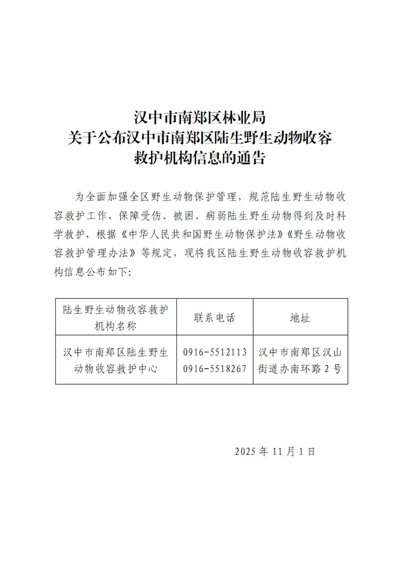 汉中市南郑区林业局关于公布汉中市南郑区陆生野生动物收容救护机构信息的通告